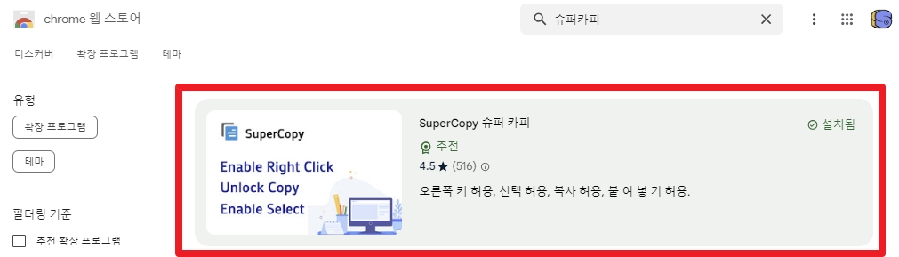 크롬 웹 스토어 초기화면에서 상단의 검색 창에 '슈퍼카피' 입력한 후에 또 엔터키 누릅니다.