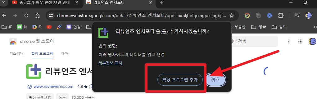 클릭하면 상단에 또 다른 팝업창이 보이고, 여기서도 '확장 프로그램 추가' 클릭하면 바로 설치됩니다.