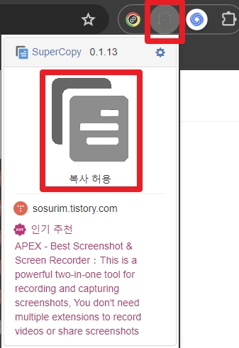 사이트 검색하시면서 필요한 부분은 복붙 가능하신데요, 혹시라도 복사가 잘 되지 않으면 크롬 브라우저 상단의 슈퍼카피 버튼 클릭하면 나오는 이미지에 마우스 얹어두면 페이지 색깔이 회색에서 하늘색으로 바뀌면서 '클릭하여 복사 허용'으로 바뀔 때 클릭하면 정상적으로 작동됩니다.