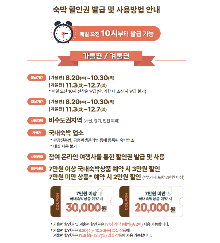 쿠폰은 매일 오전 10시부터 선착순으로 발급되며, 하루 1인당 1매만 가능합니다. 중복 발급, 양도 불가하며 사용 기한은 발급 당일부터 다음 날 오전 7시까지로 매우 짧습니다. 공식 홈페이지 또는 41개 참여사(야놀자, 여기어때, 네이버여행 등) 플랫폼에서 발급 가능합니다.